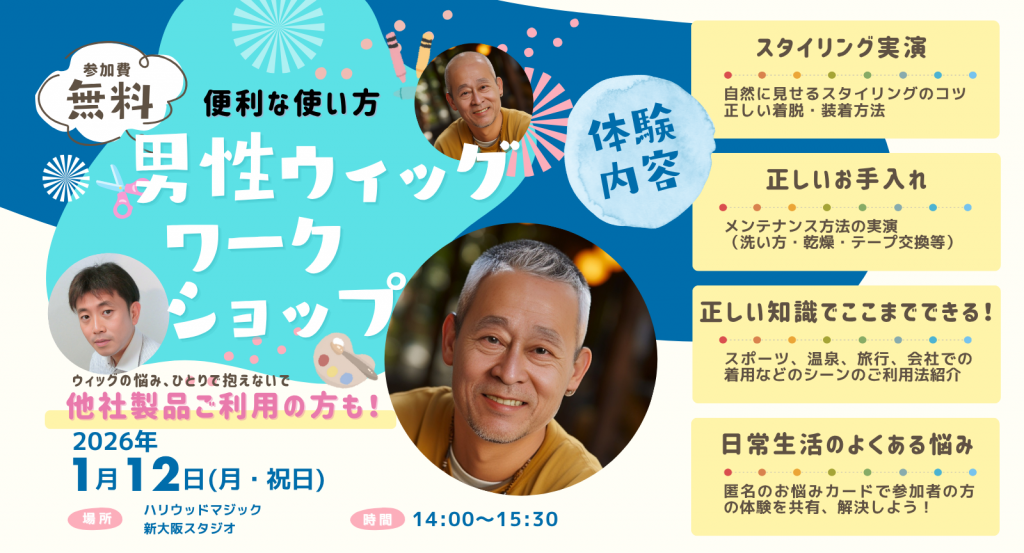 株式会社ハリウッドマジックが開催する『男性ウィッグワークショップ』は、現在かつら・ウィッグをお使いの方、ご検討中の方がご参加いただける参加費無料の少人数制イベントです。